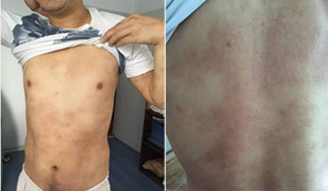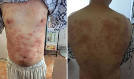 治疗前:前胸、小腹及后背 有大面积风团,皮损面积>70%,伴有剧烈瘙痒 常再发作